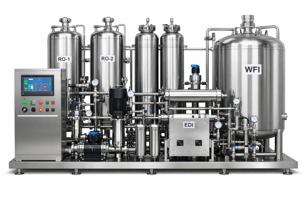 - ۲. آب برای تزریق (WFI): WFI برای داروهای تزریقی و محصولاتی که مستقیماً وارد بدن میشوند استفاده میشود. این آب باید به طور کامل عاری از اندوتوکسین و میکروبها باشد و از طریق روشهایی مثل تقطیر چندمرحله ای تولید میشود.
