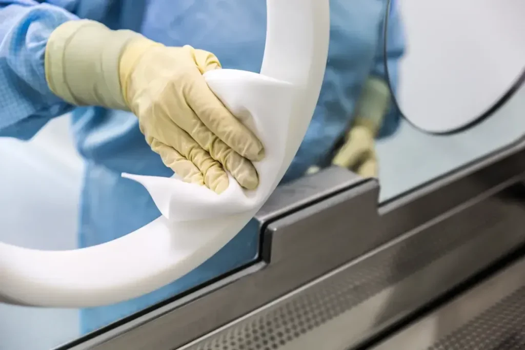 در صورت وجود بقایا یا نواحی حساس، آبکشی با آب خالص/WFI انجام و سپس خشکسازی کنترلشده در جریان لامینار دنبال میشود. مستندسازی ماده/غلظت/LOT، مساحت، اپراتور و زمان تماس، بههمراه پایش زیستمحیطی پس از خشکشدن، تحلیل بقایا و برنامه چرخشی مواد (روزانه الکل، هفتگی QAC/اکسیدکننده، ماهانه اسپورکُش) الزامی است. ملاحظات ایمنی شامل اشتعالپذیری الکلها، خورندگی اکسیدکنندهها و منع مخلوطسازی خودسرانه بوده و آموزش اپراتورها در تکنیک Wiping، رقیقسازی و مدیریت پسماند جزء لاینفک فرایند است.